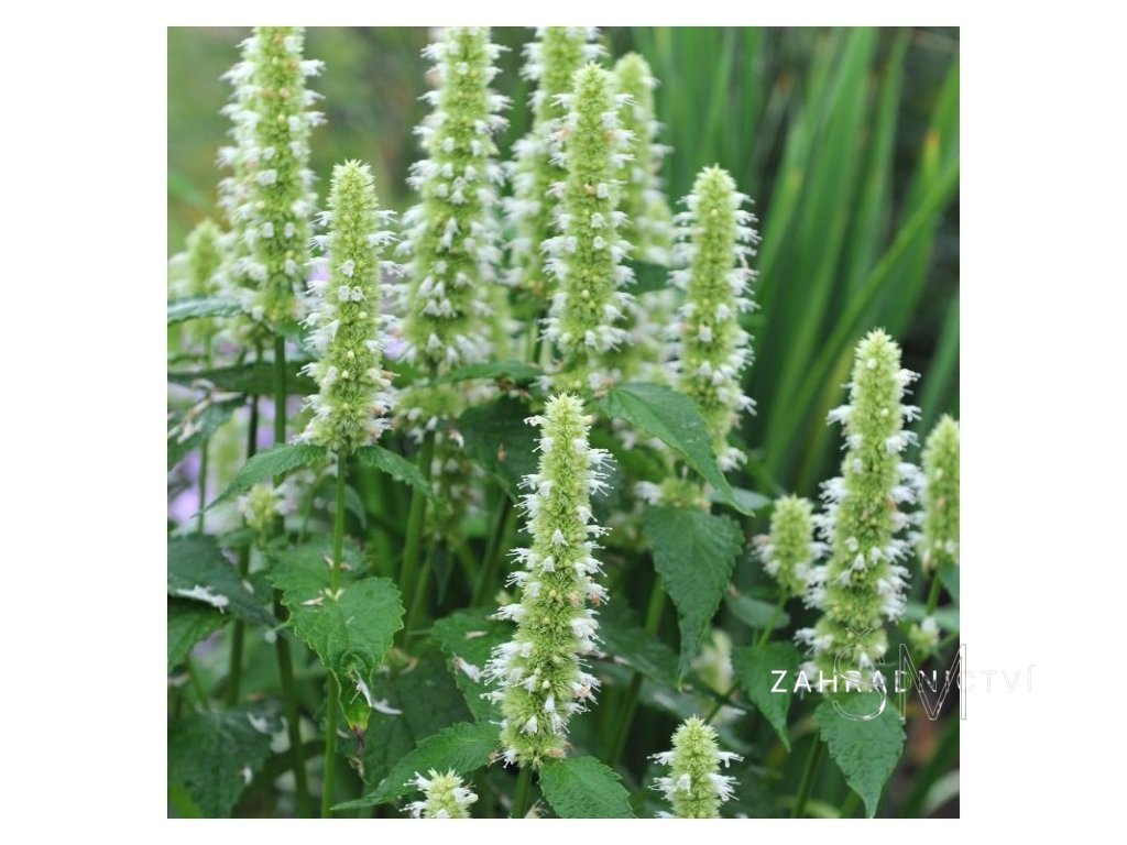 v létě vykvétá agastache velkým množství bílých květů, které jsou medonosné, proto je často vysazováno jako rostlina pro pastvu včel, čmeláků a motýlů. Po odkvětu vytváří semena, je schopna se na stanovišti přesévat. Agastache prospívá na slunečném stanovišti v propustné, spíše sušší zemině. Osvědčila se i výsadba do tzv. štěrkových záhonů, kde díky dobré drenáži nehrozí nebezpečí přemokření půdy, zvláště v zimě a předjaří. Agastache vytváří vzpřímené bylinné keříky o výšce 70 - 90 cm, listy vydávají mátovo - anýzovou vůni. Je doporučována při nachlazení, angíně, horečkách a bolestech zubů. Aromatické listy jsou používány jako koření do pokrmů, do čajových směsí.