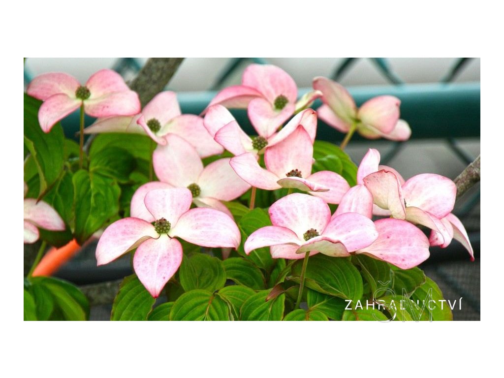 Velmi nápadné narůžovělé až sytě růžové listeny, obklopující drobné pravé květy. Kvete bohatě v červnu až červenci. Patří k nejintenzivněji vybarveným kultivarům Cornus kousa.