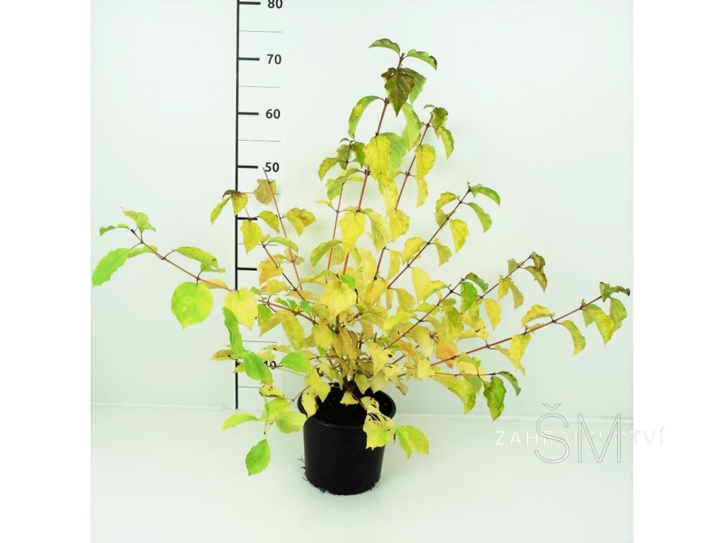 Oválné, sytě zelené listy jsou během léta nenápadné. Na podzim se vybarvují do žlutých, oranžových, růžových až červených tónů. Po opadu listů vyniká zimní efekt výhonů.