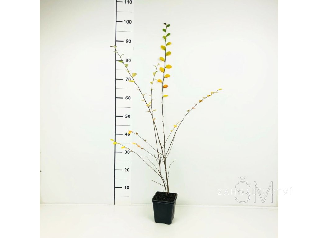 (polo)opadavý, široce rozkladitý keř, dorůstá výšky 1–4 m, letorosty šedočerné nebo hnědočerné, zprvu hustě chlupaté, plody tmavočervené nebo korálově červené, téměř kulovité až obvejcovité a 5–9 mm v průměru, 3–5 peciček, původ střední Čína