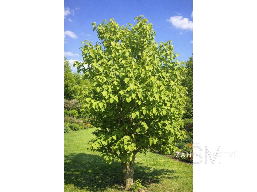 Velké, srdčité, svěže zelené listy s jemně pilovitým okrajem. Na podzim se vybarvují do žlutých odstínů a zvyšují okrasnou hodnotu stromu.