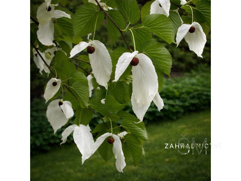 Nenápadné květy jsou obklopeny dvěma velkými bílými listeny, které připomínají kapesníky nebo holubice. Kvete v květnu až červnu a patří k nejvýraznějším okrasným stromům jara.