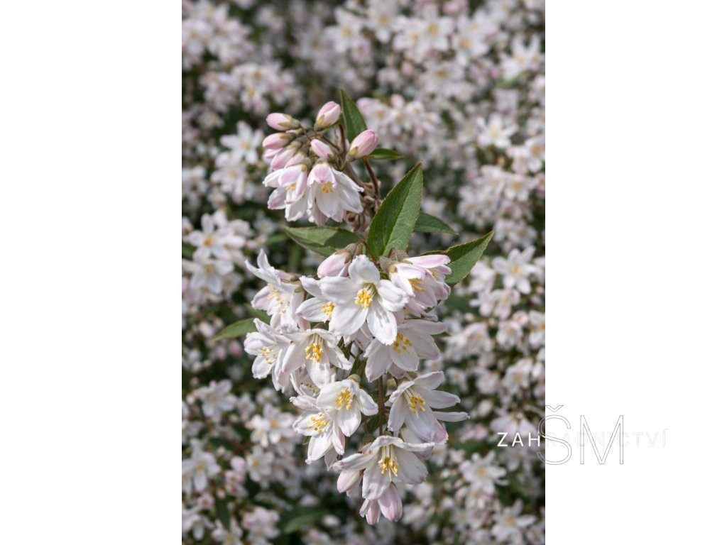 Velmi bohaté, čistě bílé, hvězdicovité květy uspořádané v hustých chocholících. Kvete v květnu až červnu a působí jemně a elegantně.
