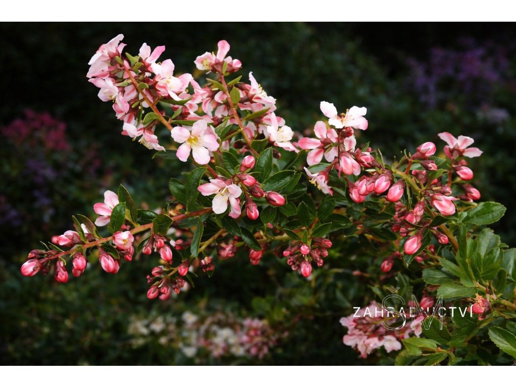 Bohaté trsy jemně růžových květů s bílým středem, připomínající barvu jabloňového květu. Kvete dlouho, obvykle od června až do září, někdy i déle.
