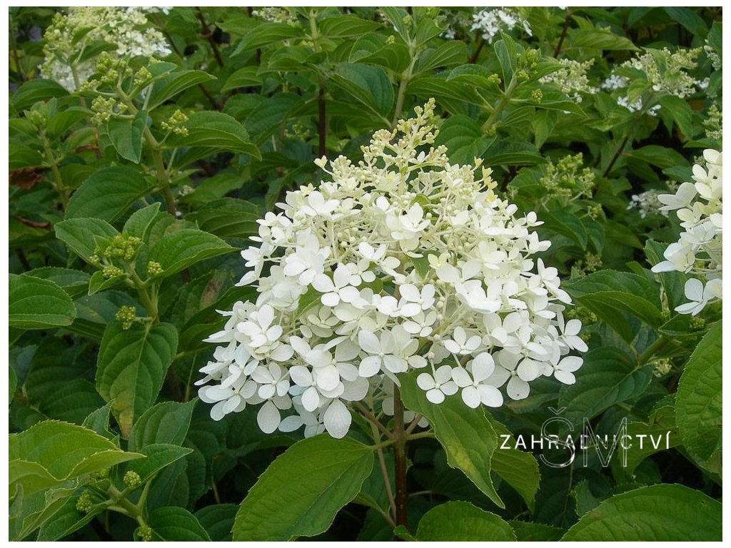 Je opadavý keř patřící do čeledi Hydrangeaeceae – hortenziovité. Dorůstá do výšky 1,5-2 m a vytváří vzpřímený keř s částečně převisajícími postranními větvemi. Celá rostlina je hustě olistěna velkými, sytě zelenými listy. Bílé květy uspořádané v latách na koncích výhonů dosahují délky až 30 cm a kvetou v průběhu července. Když už jsou noci chladnější, dostávají světle růžový nádech. Kvete na letošních výhonech, proto je možné ji tvarovat a na jaře rostliny zkrátit až na pevnou kostru, aby hustě a bohatě kvetly.