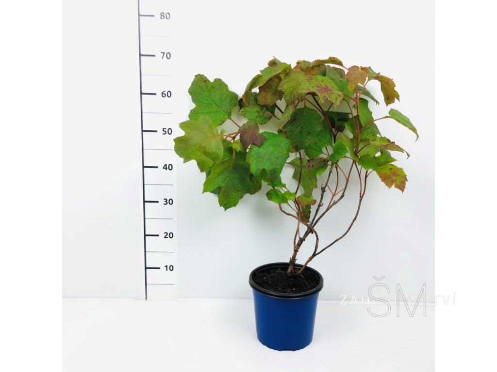 Je to široce zaoblený, opadavý keř. List má ostře vyřezávané cípy a hluboké laloky. V létě je středně zelený a koncem léta získává načervenalý nádech. Květ je bílý a postupně se zbarvuje do růžova. Stanoviště nejlépe polostinné, ale zvládne i slunné. Půdu požaduje organicky bohatou, středně vlhkou, dobře propustnou a mírně kyselou. Řez není nutný. Plně mrazuodolná