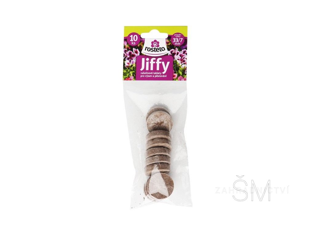 Jiffy jsou vyrobeny z kvalitní rašeliny s obsahem vápence a obohaceny základními živninami. Jsou opatřeny rozložitelnou síťkou, která drží tvar po nabobtnání. Používají se k řízkování, pikýrování a množení např. jahod.