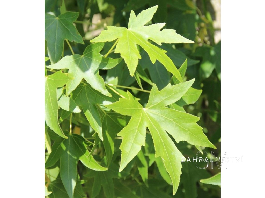 Velké, hluboce dlanitě laločnaté, lesklé zelené listy připomínající javor; na podzim se spolehlivě vybarvují do sytých odstínů oranžové, červené a purpurové, patří k nejvýraznějším podzimním stromům.