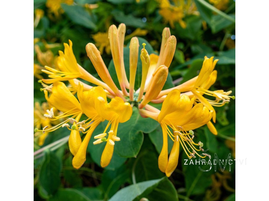 opadavá popínavka, která byla vyšlechtěna v Maďarsku. Dosahuje výšky až 6 metrů. Nové výhony jsou zalenohnědé barvy. Listy jsou sytě zelené, na rubu bíle ojíněné, vrchní pár listů je srostlý. Kvete v červenci a srpnu jasně žlutými květy v koncových přeslenitých květenstvích. Plodem je červená kulatá bobule. Nejlépe prospívá na slunném či polostinném stanovišti s dobře propustnou, dostatečně vlhkou půdou. Na zimu je vhodná přikrývka, zejména u mladých rostlin. Mrazuvzdornost se uvádí do - 23 °C (zóna 6a). Je nenáročný na pěstování.