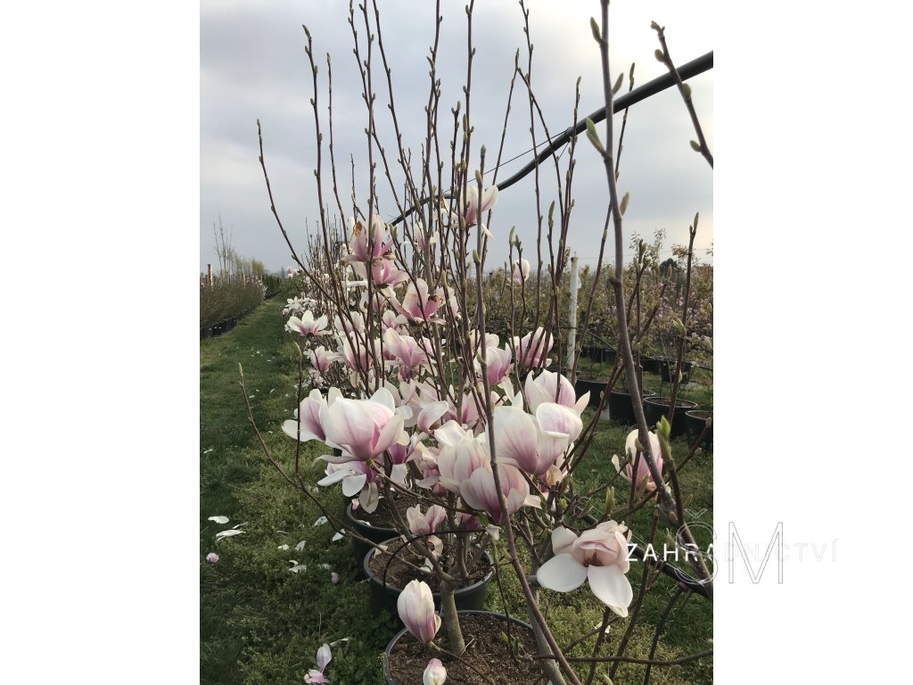 Listy jsou vejčité až oválné, sytě tmavě zelené, mírně zvlněné, tuhé a plně olistěné. Květy jsou ve tvaru širokých tulipánů (až 30 cm široké), zvenčí narůžovělé až slabě nachové s přechodem do bílé v horní části okvětních plátků, uvnitř bílé. Květy intenzivně voní. Je to nejrannější kvetoucí strom. Kvete v dubnu. Rostlinu sázíme na chráněné stanoviště před mrazem, aby se poupata při jarních mrazících nespálila. Zeminu vyžaduje vysoce výživnou, mírně kyselou, neustále vlhkou, ale propustnou. Rostlina má ráda zamulčování. Řez se provádí u mladých rostlin. Provádíme ho na jaře ihned po odkvětu, aby rostlina stihla nasadit poupata pro následující rok. Keř je plně mrazuodolný.