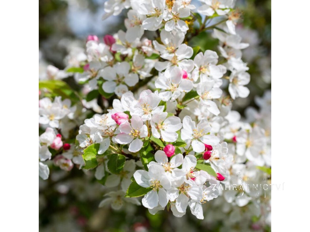 Květy jsou bílé s jemně narůžovělými poupěty, rozkvétají bohatě na jaře (duben–květen) a patří k nejatraktivnějším mezi okrasnými jabloněmi.