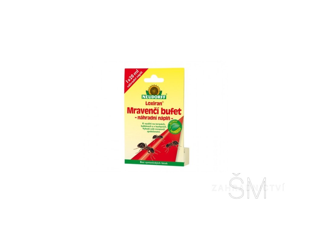 Mravenci přijímají návnadový roztok velmi dychtivě a transportují ho do mraveniště. Tam jím pak krmí dělnice, larvy i královnu, a tím se vyhubí během 1 až 2 týdnů celé mravenčí společenstvo. Možné dopňování náhradní náplňí s návnadovým roztokem, který obsahuje přírodní insekticid. Náplň je určena pro doplnění návnadových dóz přípravku proti mravencům Loxiran Mravenčí bufet, který se používá k odstranění mravenců na terasách, balkónech, cestách i v obytných prostorech. Návnadové dózy umístíme do bezprostřední blízkosti mravenišť nebo přímo na mravenčí stezky. Pro likvidaci větších mravenišť je nutno použít nejméně dvě návnadové dózy.