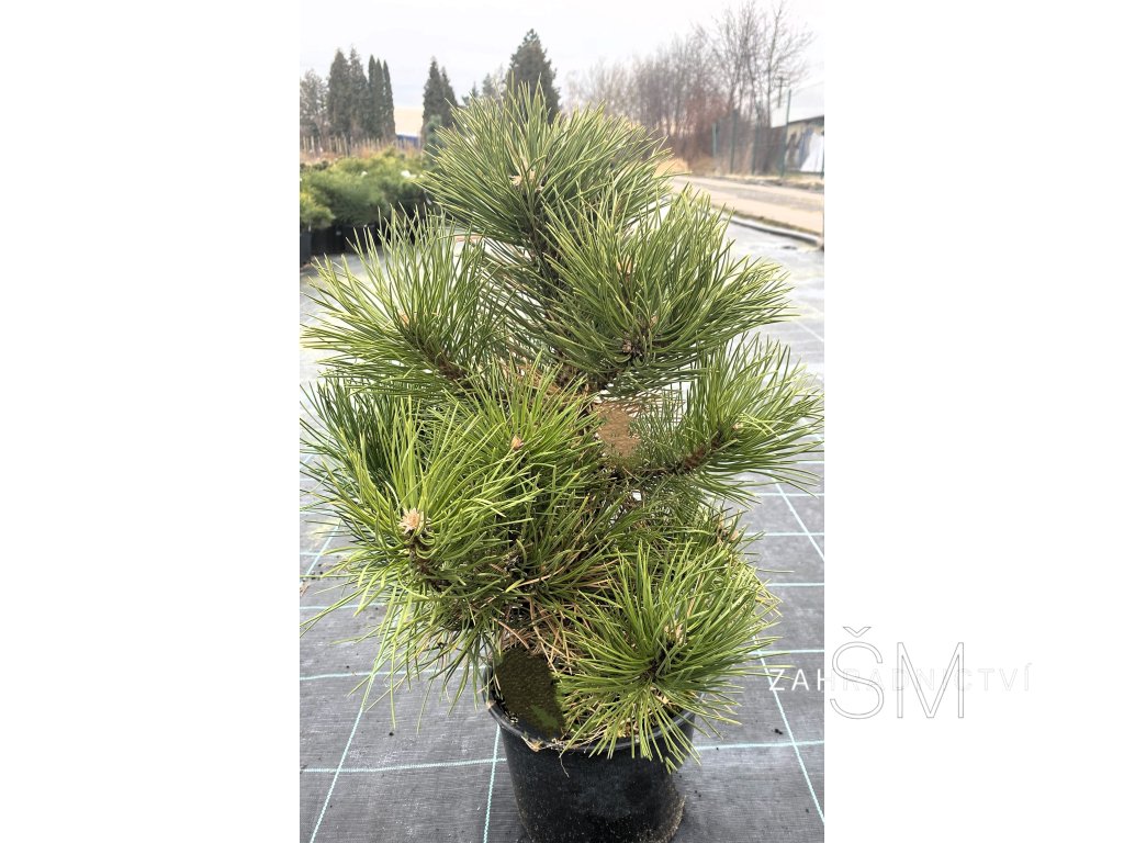 pomalu,zakrsle rostoucí druh borovice s výškou 1,2m a šířkou 1,5m.Sytě zelené jemné jehlice ,na jaře výrazné šedohnědé pupeny.Použití do větších skalek ,solitera .